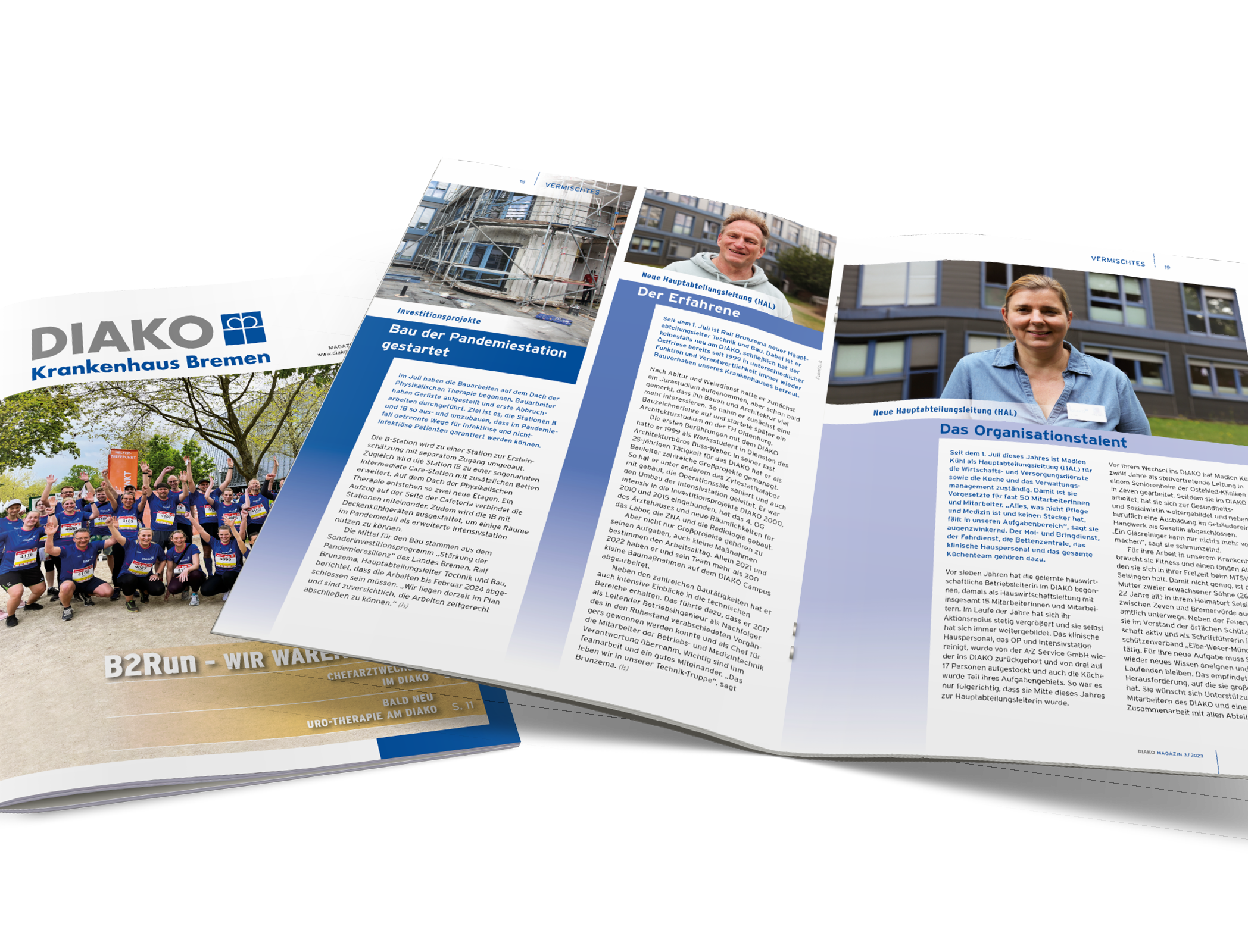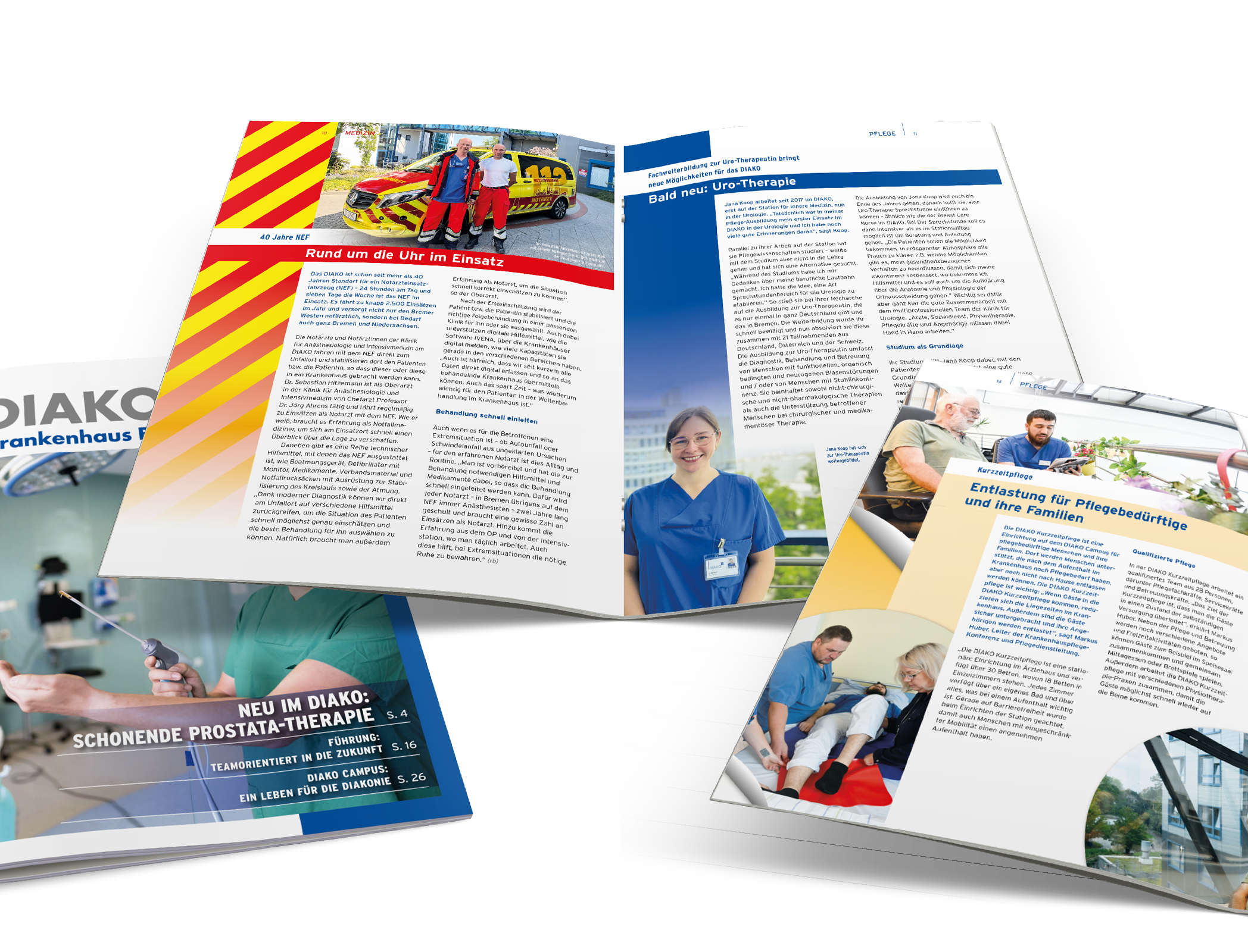 Von 2011 bis 2023 betreute ich im Rahmen meiner Tätigkeit bei GuS Kommunikation GmbH das Mitarbeitermagazin des DIAKO Krankenhauses. Die Publikation greift interne Entwicklungen, medizinische Innovationen sowie Geschichten aus dem Klinikalltag auf. Mein Verantwortungsbereich umfasste Layout, Abstimmung, Reinzeichnung und Druckvorbereitung.