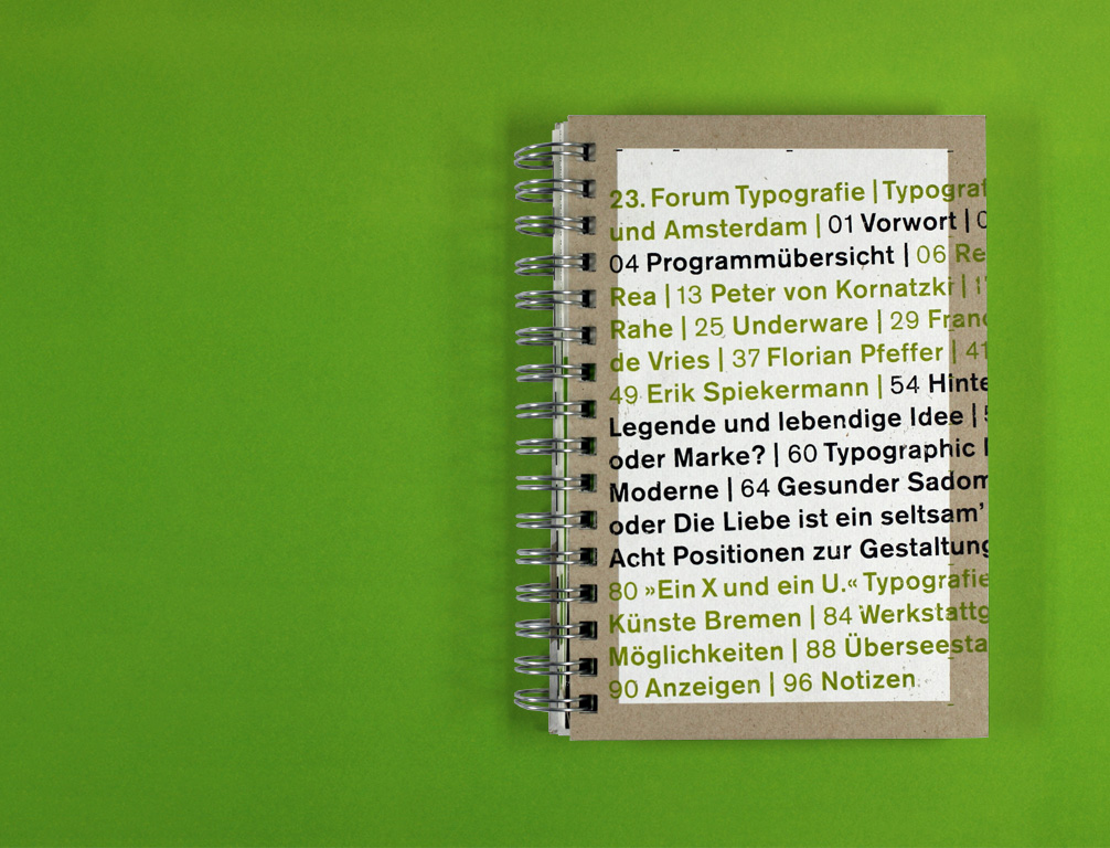 Mitwirkung an Organisation, Konzept und Gestaltung der 23. Ausgabe des Forums Typografie an der HfK Bremen. Entwicklung eines Programmbuchs im Sieb- und Offsetdruck, ergänzt um redaktionelle »Störerseiten«. Das visuelle Konzept erstreckte sich über die gesamte Veranstaltungskommunikation.